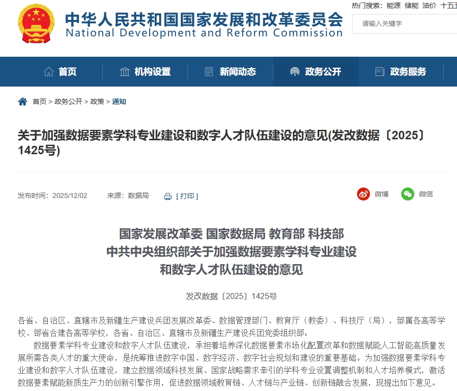 中国经济网北京12月2日讯(记者 李方) 近日,国家发展改革委、国家数据局、教育部、科技部、中共中央组织部联合发布《关于加强数据要素学科专业建设和数字人才队伍建设的意见》(发改数据〔2025〕1425号),旨在建立数据领域科技发展、国家战略需求牵引的学科专业设置调整机制和人才培养模式。